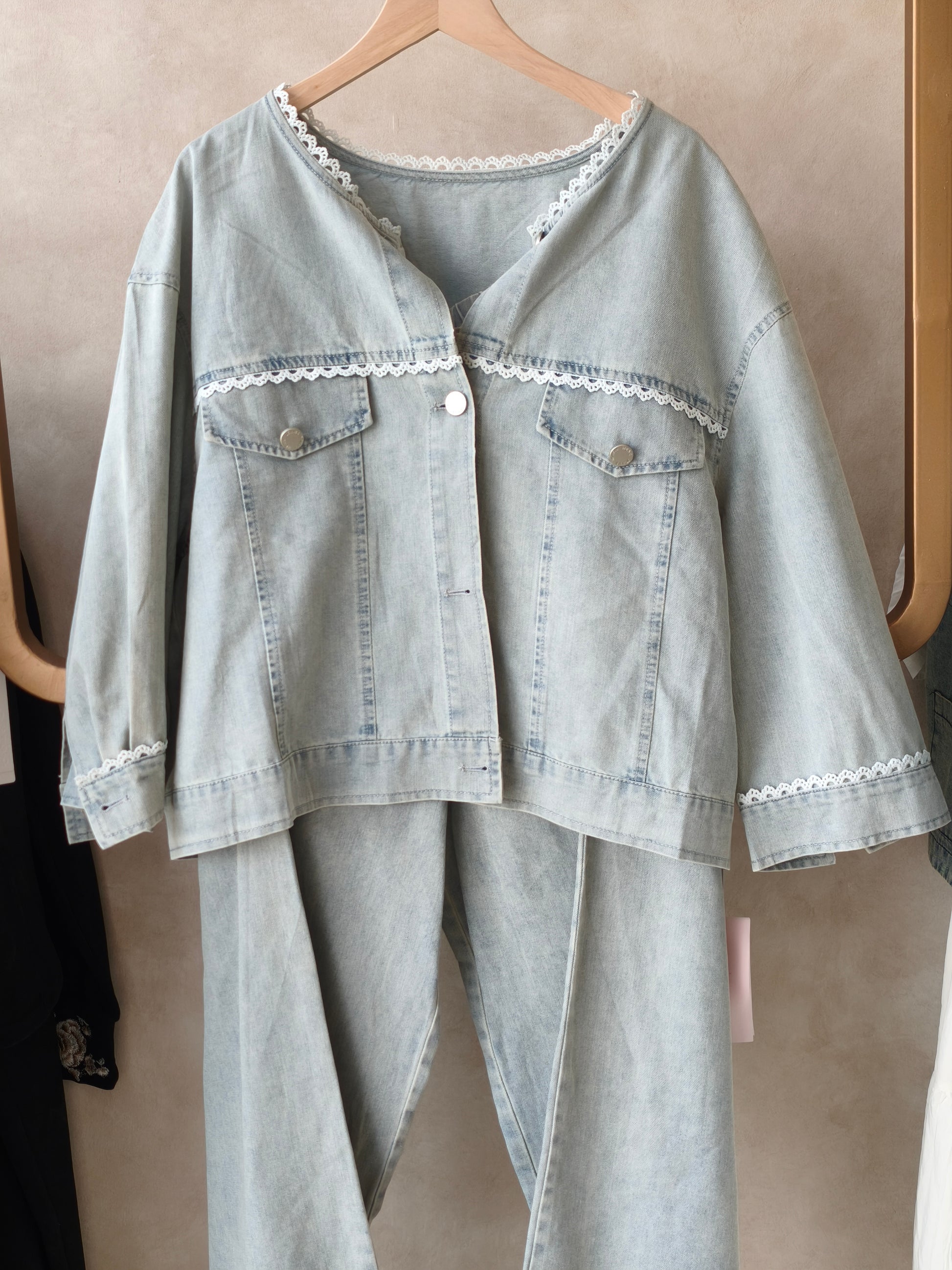 Lengkapi penampilan Anda dengan baju set cantik yang elegan terbuat dari bahan DENIM. Dimensi LD: 112 cm, PA: 52 cm, LP: 70 cm, PB: 90 cm.